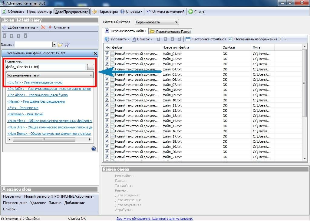 3) В поле Новое Имя вводим будущее название файлов и выбираем Установленные Теги (в моем случае — увеличивающееся число).