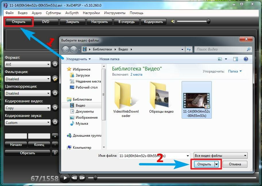 2. Жмем Открыть (1), находим и добавляем видео (2).