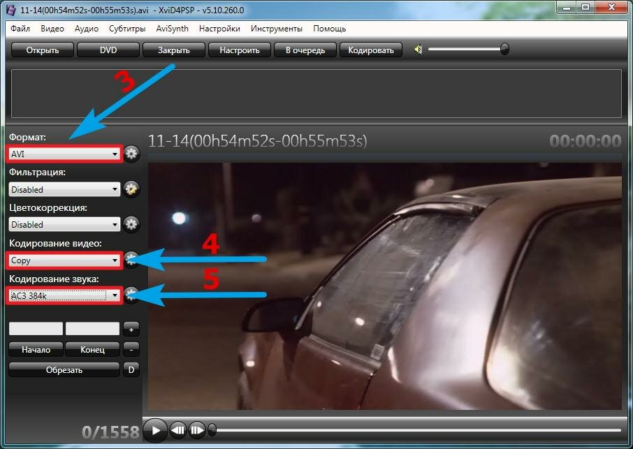3. В поле Формат выбираем контейнер видео (в моем случае avi) (3),в Кодировании видео выбираем Copy (4), а в Кодировании звука – формат mp3 (5).