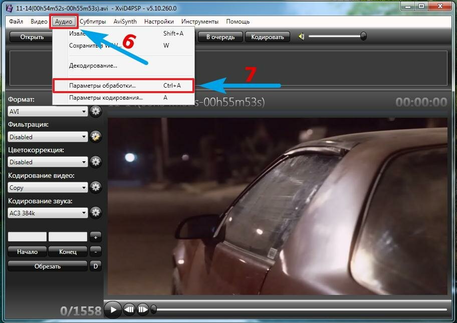 4. Затем кликаем по кнопке Аудио (6) и переходим в Параметры обработки (7).