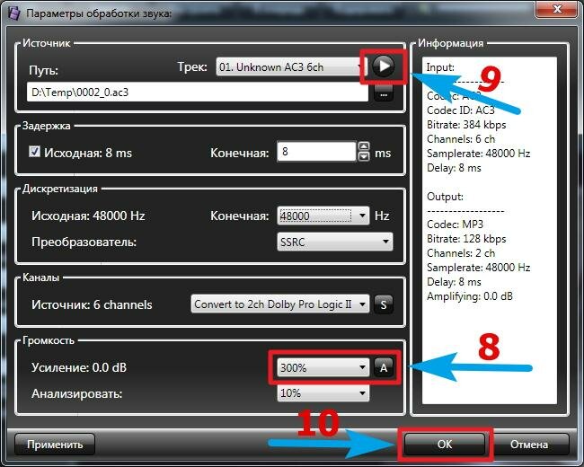 5. В поле Громкость выставляем значение в процентах и жмем кнопку А (8). При желании можно прослушать насколько увеличилась громкость, нажав на плей (9) и жмем OK (10).